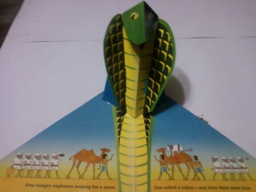Este divertido libro pop-up cuenta la historia de 6 intrépidos exploradores que van a Egipto a explorar (de allí que el libro tenga forma de triángulo y se asemeje a una pirámide). En cada página se van encontrando nuevos peligros y sorpresas que emergen en forma tridimensional lo que provoca que vaya quedando un explorador menos, hasta que al final en la última página, el explorador restante decida mejor irse a dormir a su cama en lugar de continuar la accidentada aventura.