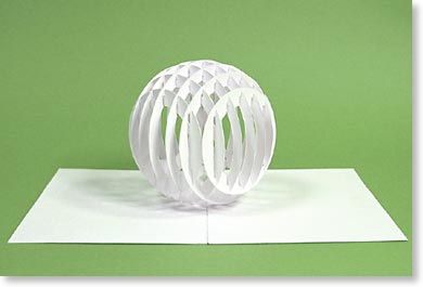 Desde la página del ingeniero de papel japonés Masahiro Chatani padre de la Arquitectura Origámica, tenemos otra aproximación a una esfera pop-up, esta vez con mecanismo de Rejilla. Aunque no viene ninguna plantilla (solamente fotos, incluyendo una imagen animada que muestra como se ve la esfera 3D al abrir y cerrar la tarjeta), a quien le interese (y tenga la paciencia y habilidad) podría generar el modelo.