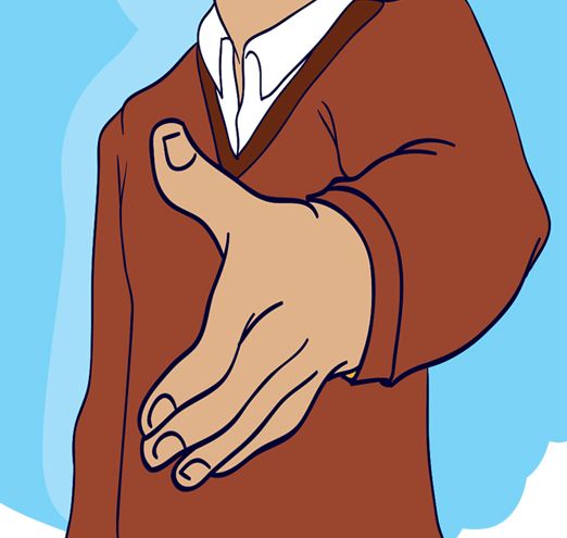 Luego de un momento de confusión, yo uso la otra mano, la cual nuevamente tropieza con la suya sin completar el apretón; él también ha cambiado de mano.